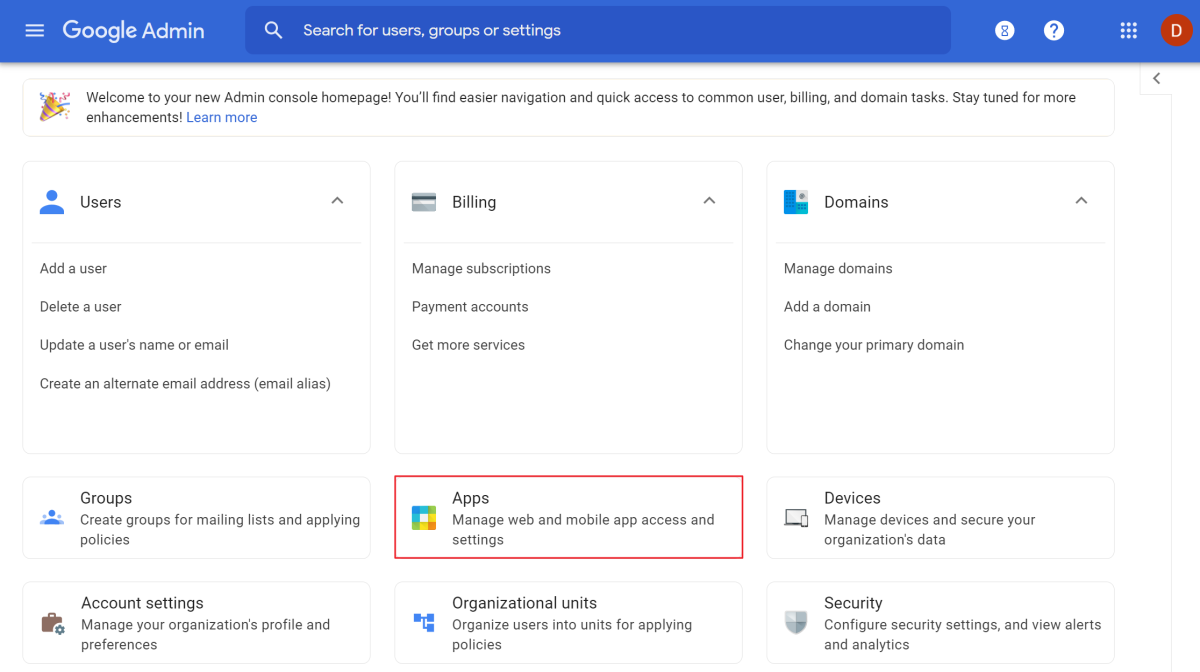 - 백업하려는 도메인의 자격 증명으로 Google Admin console에 로그인합니다.